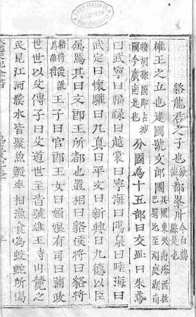 雄 王 之 立 也 建 國 號 文 郎 國 其 國 東 夾 南 海 西 抵 巴 蜀 北 至 洞 庭 湖 南 接 胡 孫 國 即 占 城 國 今 廣 南 是 也 分 國 爲 十 五 部 曰 交 趾 曰 朱 鳶 曰 武 寧 曰 福 祿 曰 越 裳 曰 寧 海 曰 陽 泉 曰 陸 海 曰 武 定 曰 懷 驩 曰 九 真 曰 平 文 曰 新 興 曰 九 德 以 臣 属 焉 其 曰 文 郎 王 所 都 也 . [3a*2*1]