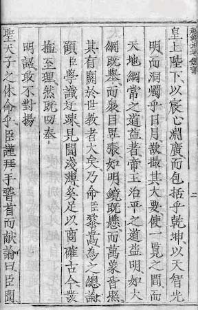 ¶ 12 Leave a comment on paragraph 12 0 於是 [2a*9*1] 皇上陛下,以宸心淵廣,而包括乎乾坤;以天智光明,而洞燭乎日月;欲撮其大要,使一覧之間而天地綱常之道益著,常王治平之道益明,如大綱既舉,而目畢張;如明鏡既懸,而萬象皆照,其有關於世教者大矣。[2b*1*1]